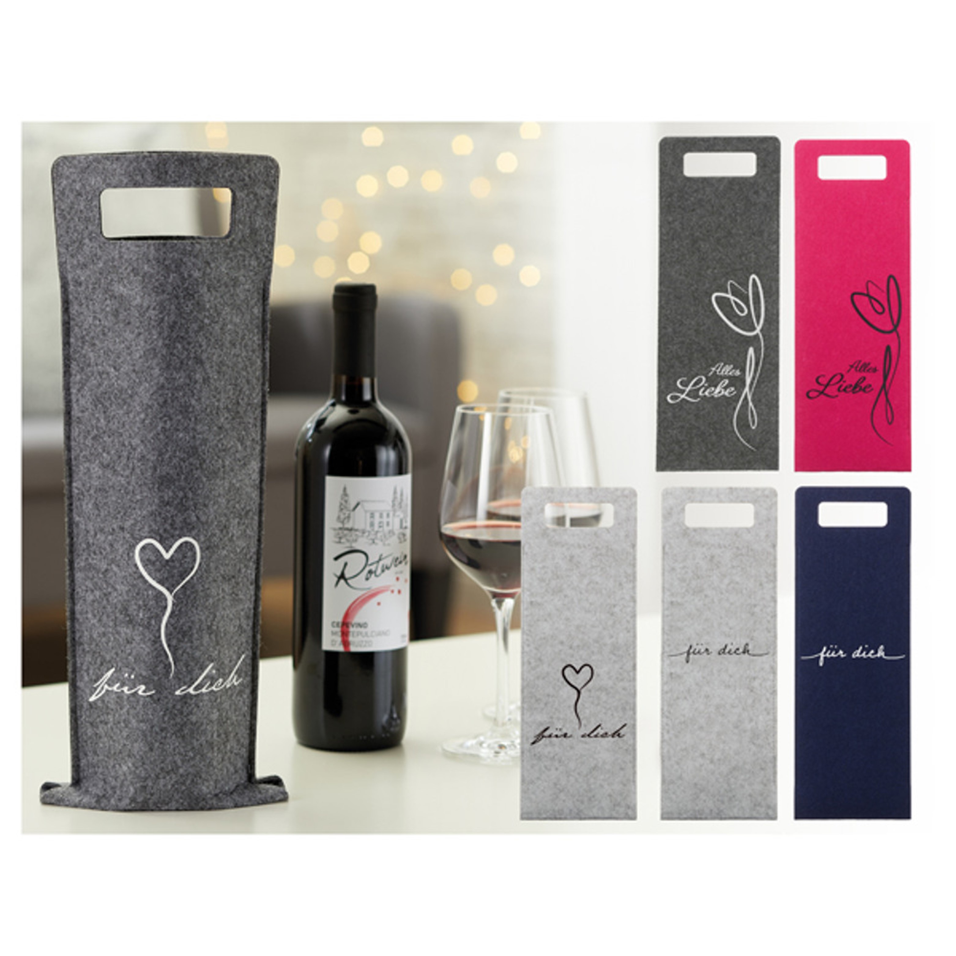 Filztasche für Weinfl. mit Sprüche 4fach
